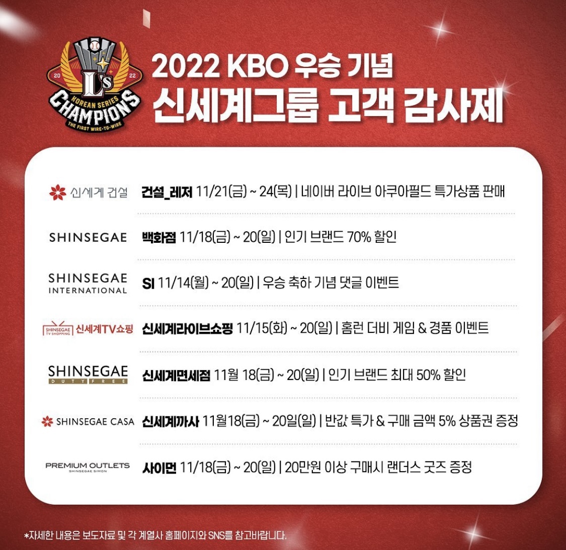 카테고리 없음 신세계 그룹 고객 감사제 날짜 확인하세요 by 위드h 2022. 11. 18. 반응형 신세계 그룹 주요 계열사들이 프로야구 SSG랜더스의 한국 시리즈 우승을 기념한 감사 이벤트를 진행한다고 합니다^^ 각 계열사마다 날짜가 상이하니 날짜 참고하셔요^^ 반응형 공유하기 게시글 관리 위드현 저작자표시 (새창열림) 댓글